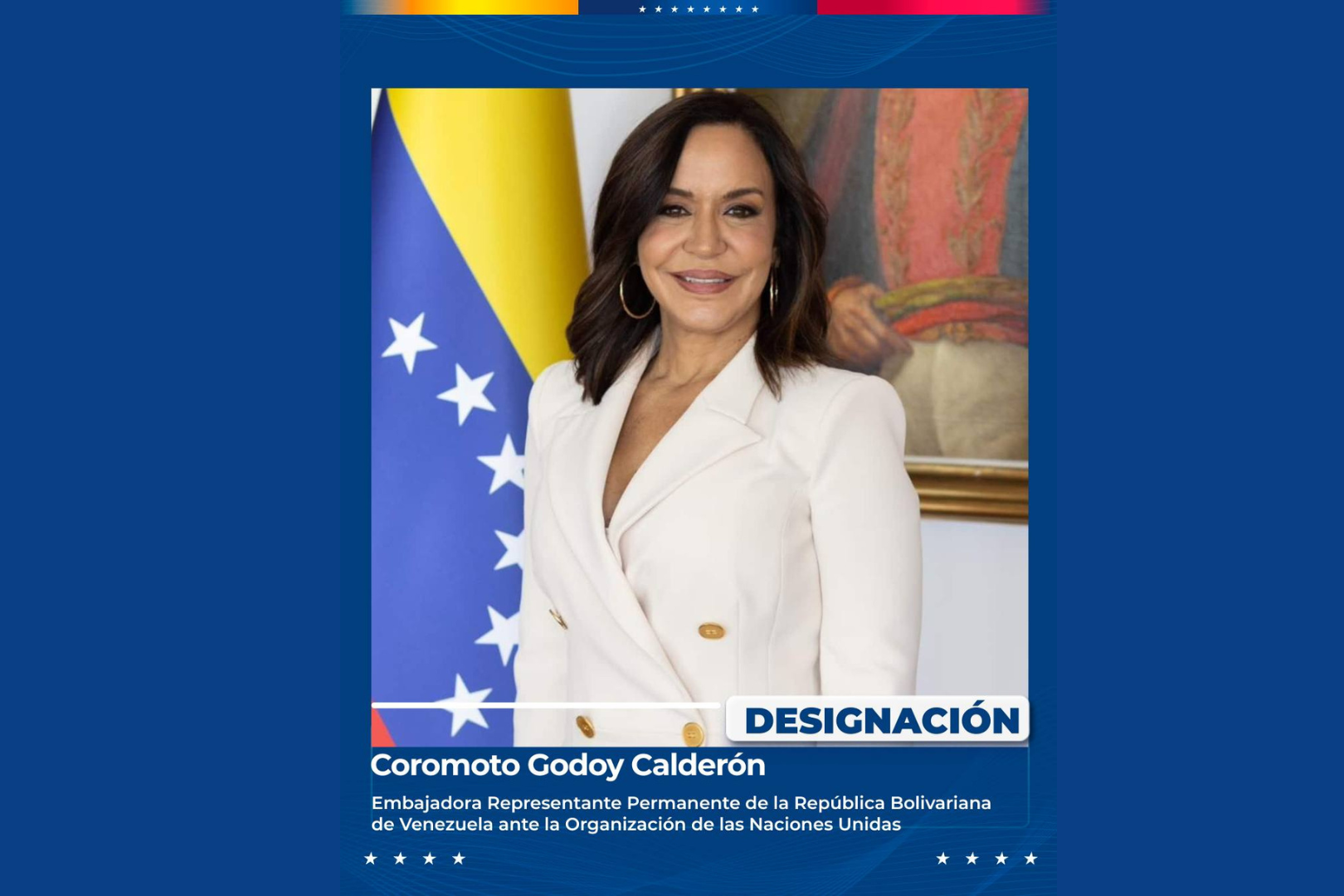 Coromoto Godoy fue designada en la mañana de este miércoles como nueva Embajadora Representante Permanente de la República Bolivariana de Venezuela ante la Organización de las Naciones Unidas (ONU), “con el compromiso de llevar la voz digna y soberana de nuestro país en el escenario multilateral”, anunció la presidenta Encargada de la República Bolivariana de Venezuela, Delcy Rodríguez.