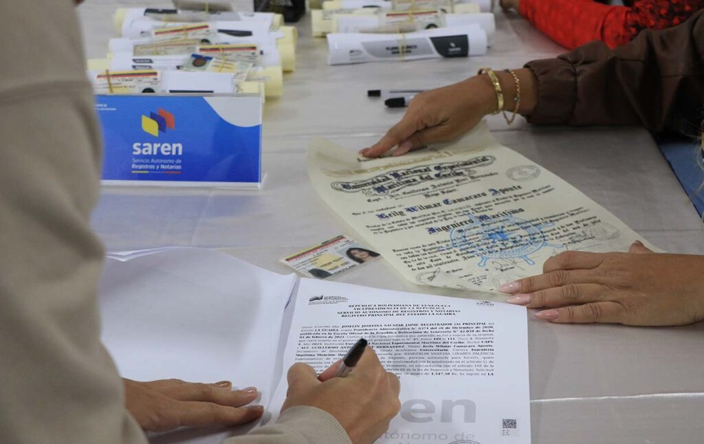 El Servicio Autónomo de Registros y Notarías (Saren) llevó a cabo una jornada de protocolización de títulos universitarios desde el Registro Principal del estado La Guaira, con el propósito de garantizar la seguridad jurídica de los documentos académicos de nuevos profesionales del país.
