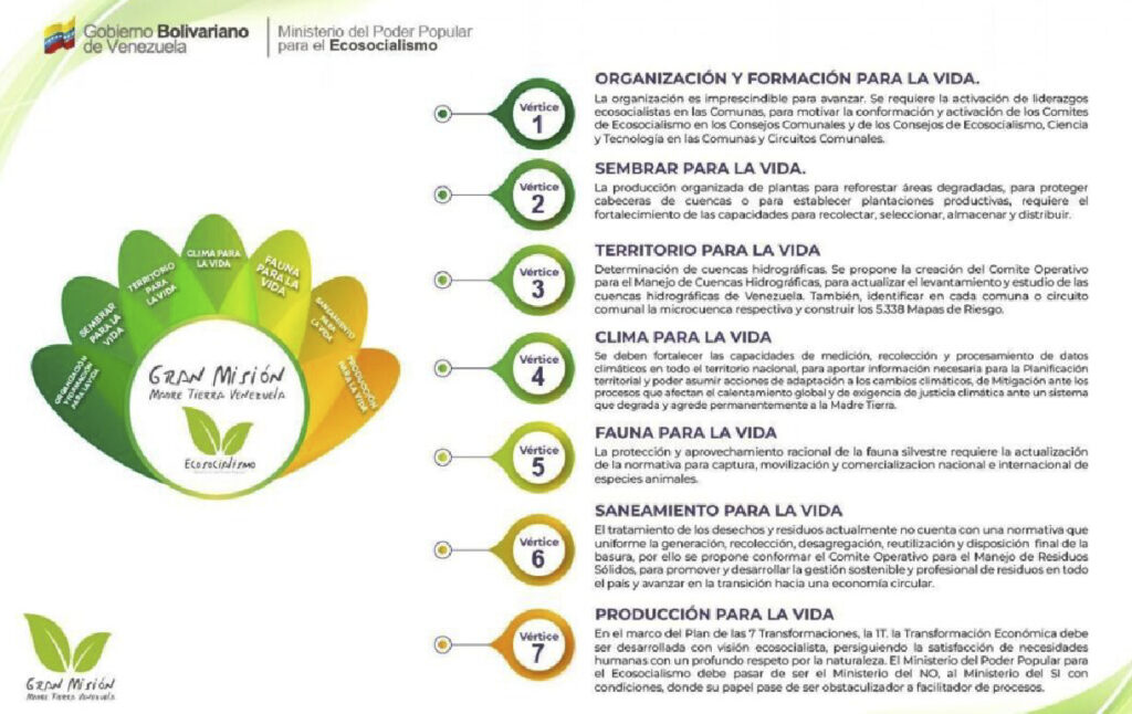 En contexto, la Gran Misión Madre Tierra Venezuelaque se dio a conocer por el jefe de Estado como “la gran misión de la vida”, cuenta con vértices enfocados en la organización de los Comités de Ecosocialismo, en los Circuitos Comunales del país.