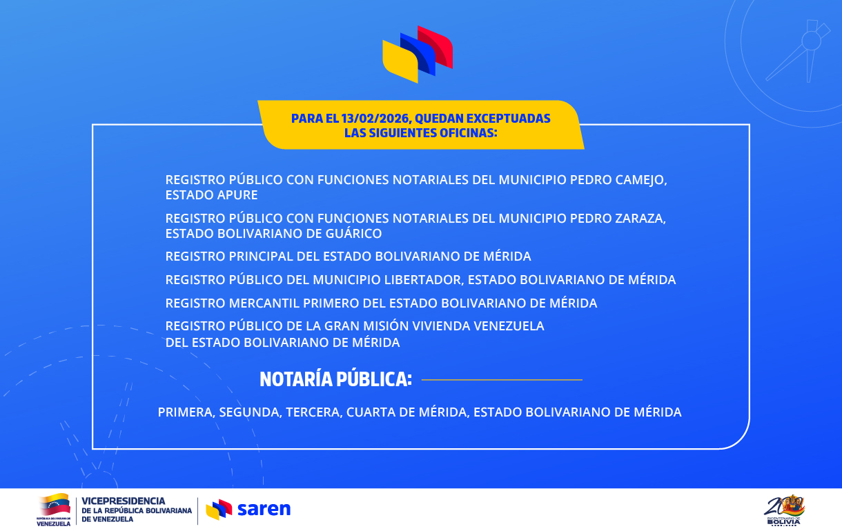 El Servicio Autónomo de Registros y Notarías (Saren), informa a sus usuarios y usuarias que no ha habido incremento en sus tasas, y que se mantienen vigentes las publicadas en la Gaceta Oficial nro. 42.301 del 20 de enero de 2022. Esto debido a que recientemente...